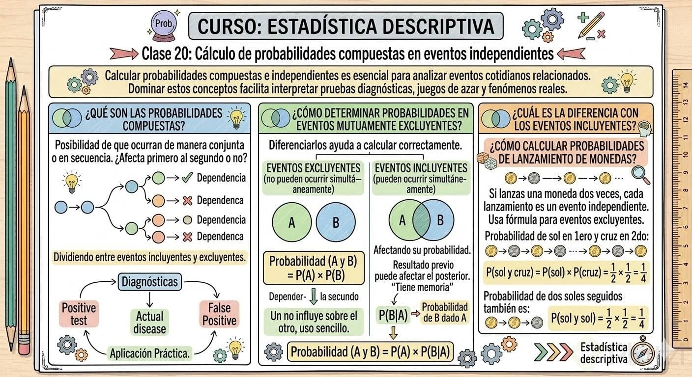 Calcular probabilidades compuestas e independientes es una habilidad esencial en estadística que te permite entender y analizar eventos cotidianos, especialmente aquellos que involucran posibles resultados relacionados. Dominar estos conceptos te facilitará interpretar pruebas de diagnóstico, juegos de azar y muchos otros fenómenos reales.
