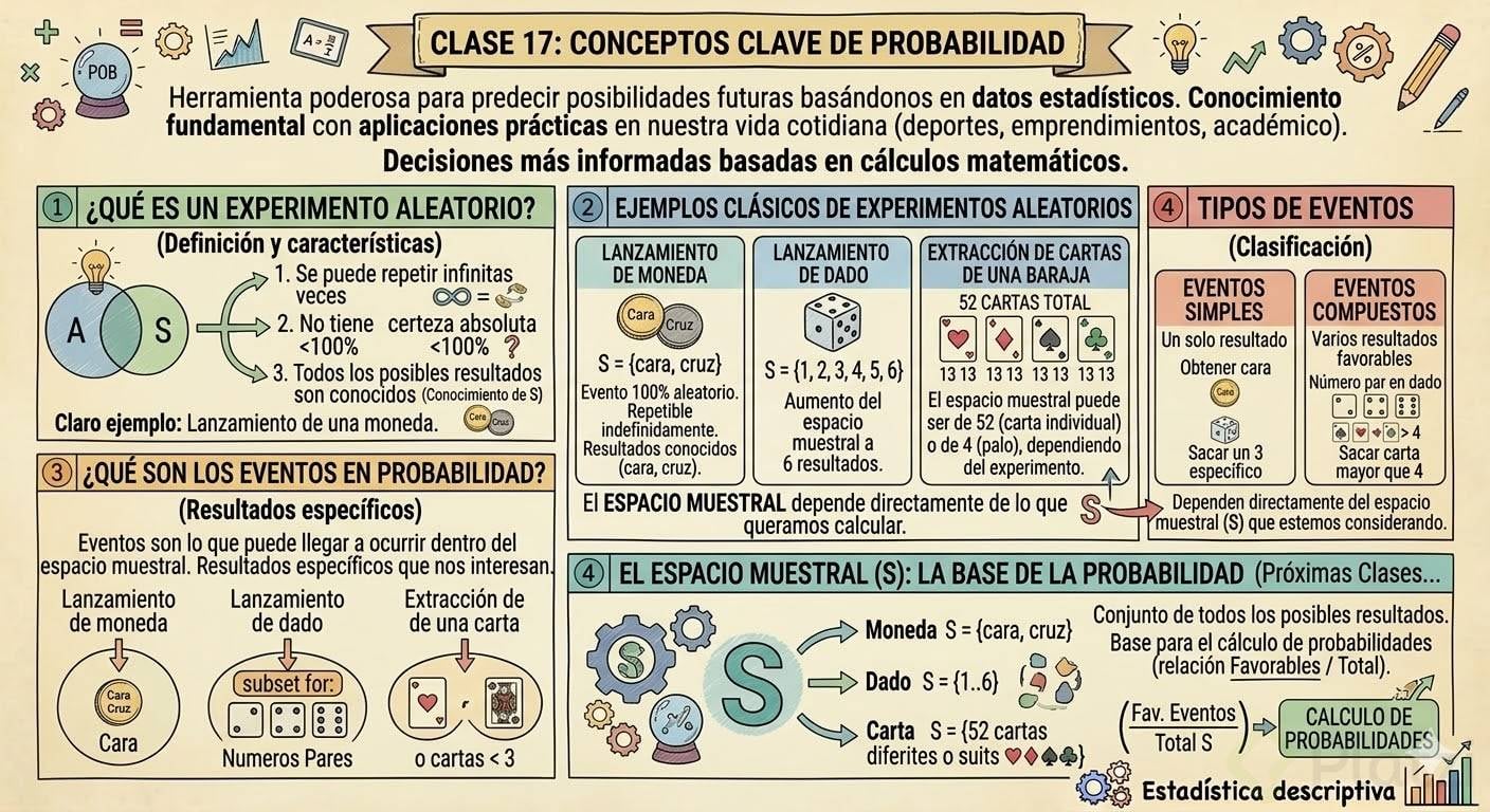 El cálculo de probabilidades se basa precisamente en la relación entre los eventos favorables y el espacio muestral total, tema que será profundizado en las próximas clases.