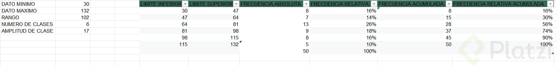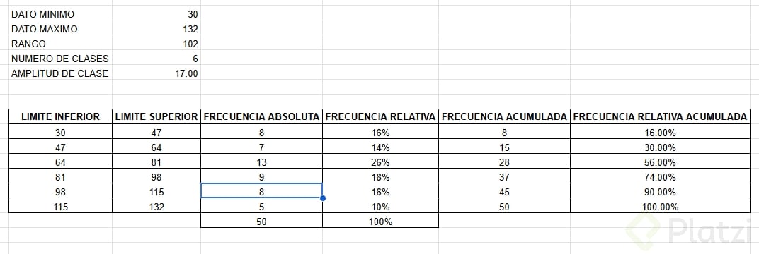 Frecuencia relativa acumulada: suma cada frecuencia relativa sucesivamente hasta llegar al 100%.