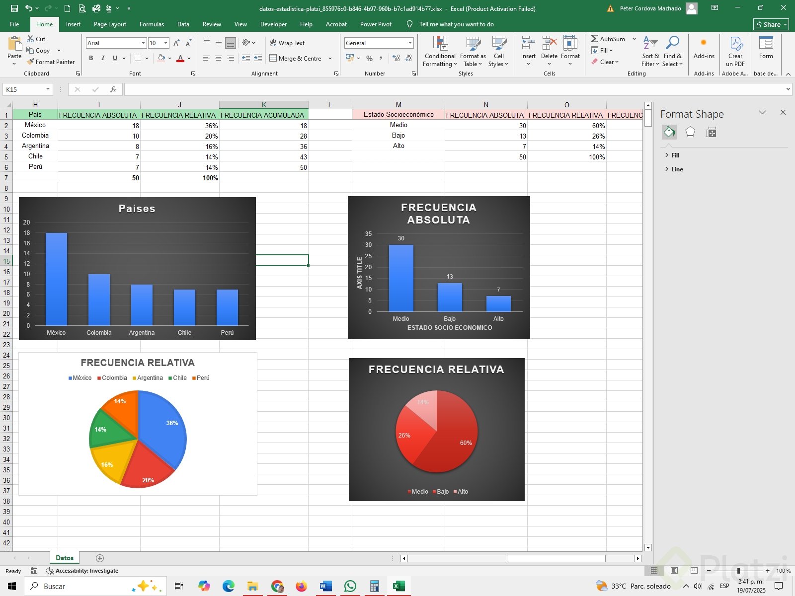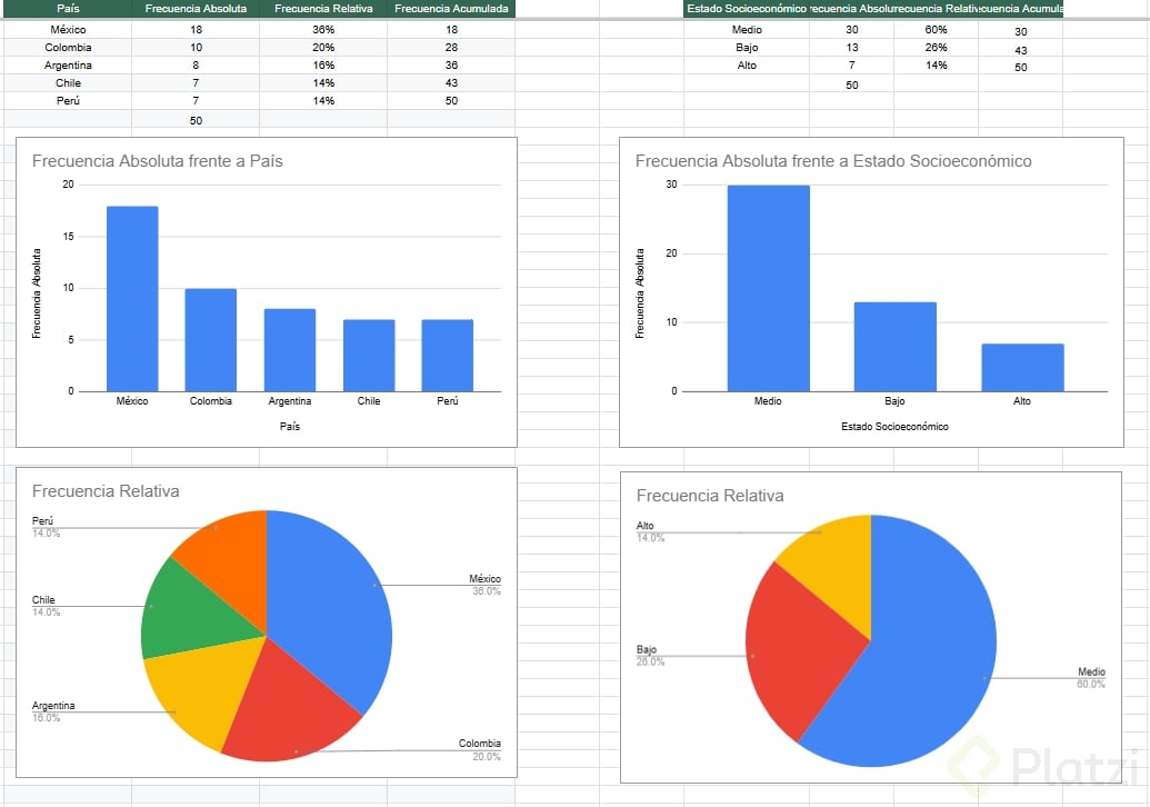 - Selecciona en Google Sheets la columna del estado socioeconómico y la frecuencia absoluta correspondiente.