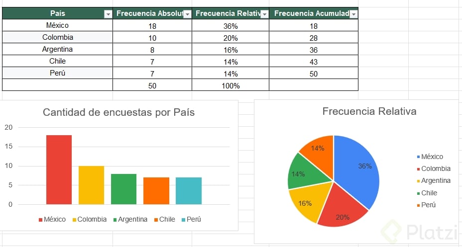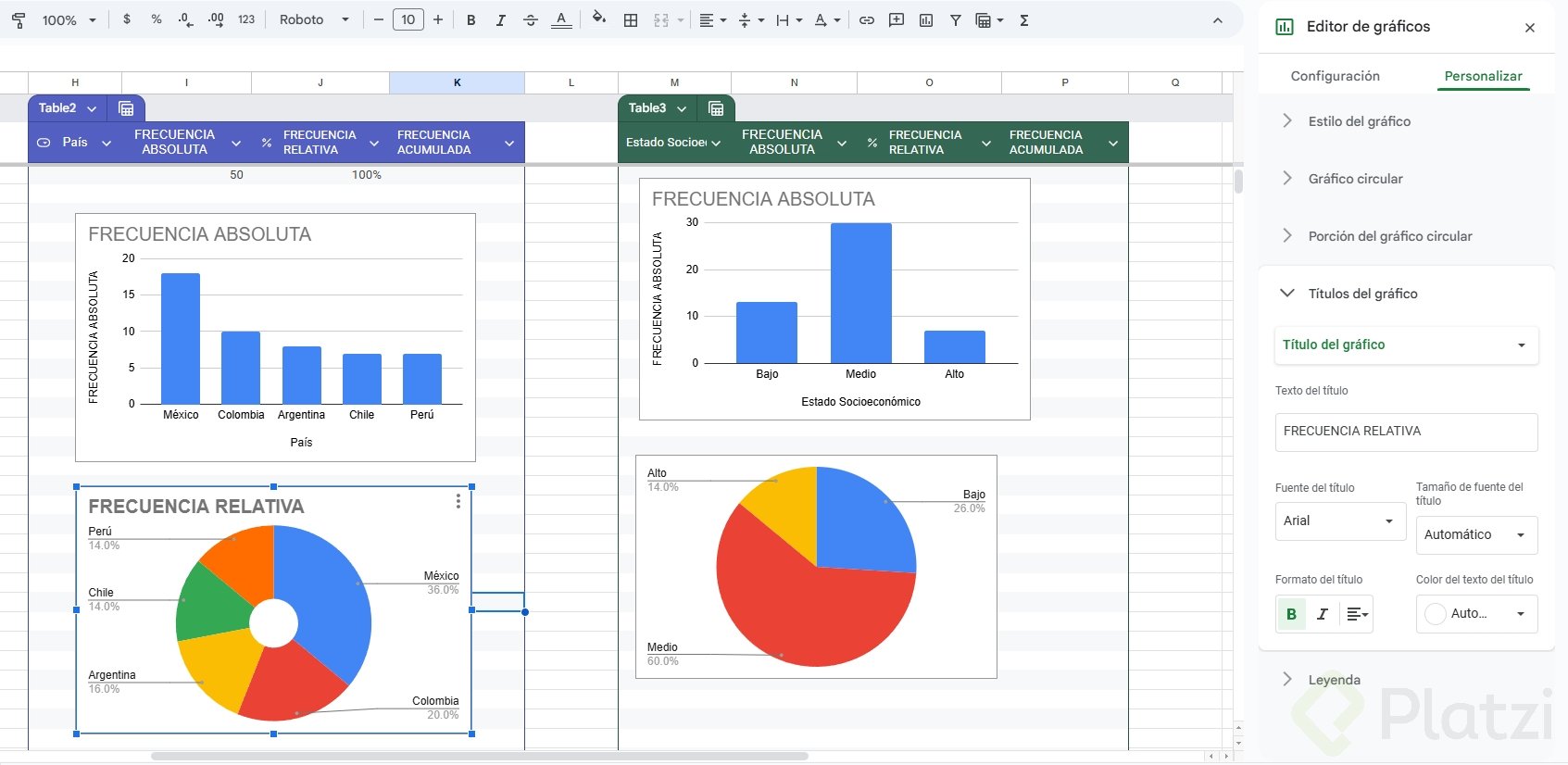 - Selecciona en Google Sheets la columna de la variable categórica y la columna de frecuencia relativa.