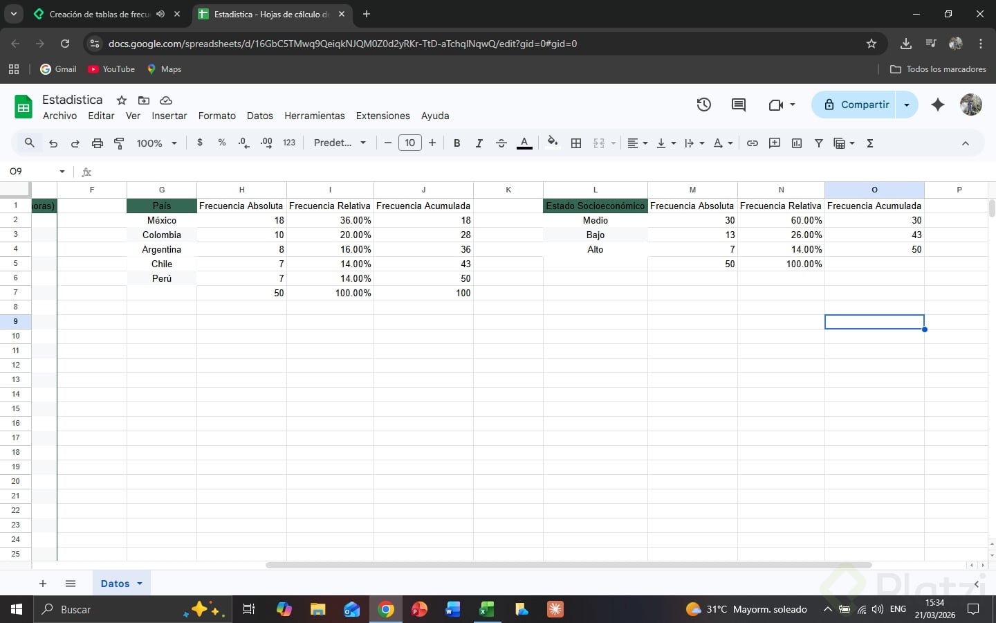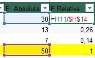 Frecuencia absoluta: se obtiene usando la función =CONTAR.SI del programa, identificando cuántas veces aparece un dato específico.