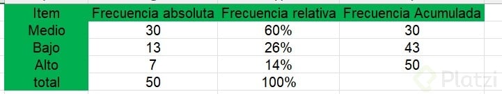 - Frecuencia acumulada: suma progresivamente las frecuencias absolutas utilizando sumas consecutivas hasta llegar al total de la muestra estudiada.