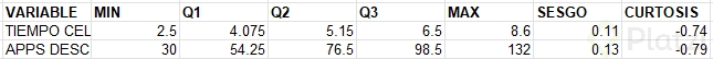 Para nuestros datos de tiempo en celular, la curtosis resultó -0.7, indicando que nuestra distribución es ligeramente más aplanada que una distribución normal.