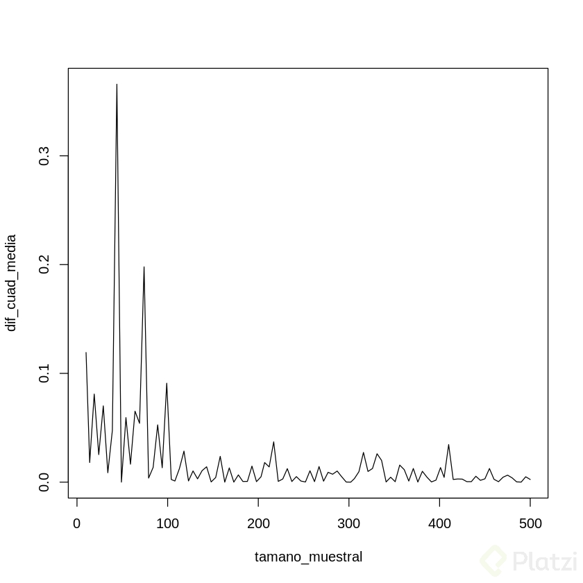 - La diferencia cuadrática disminuye, demostrando que la precisión del estimador mejora con muestras más grandes.