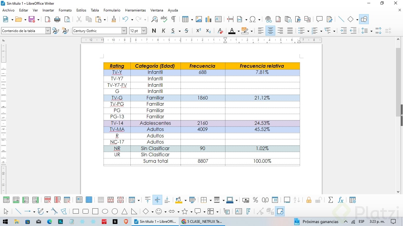 Te animo a practicar creando tus propias tablas de frecuencia y frecuencia relativa. Ordena los géneros de películas y series o considera una tabla bidimensional usando clasificación y años de estreno. Agrupa los años por décadas e infórmanos tus hallazgos en los comentarios.