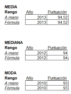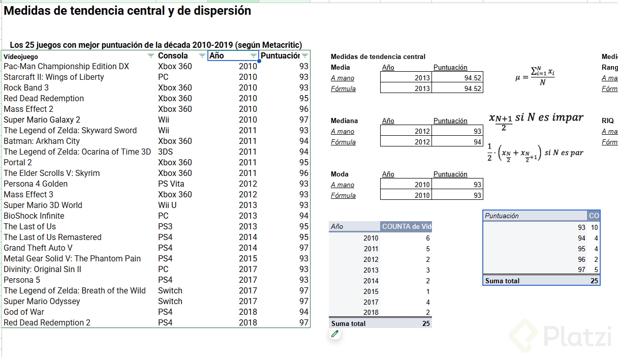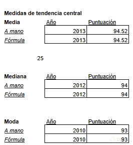 En cuanto al cálculo matemático, si tenemos 25 datos, la mediana estará en la posición ((n + 1) / 2), lo que resulta en la posición 13. Excel y Google Sheets también tienen la función MEDIANA para automatizar este cálculo.