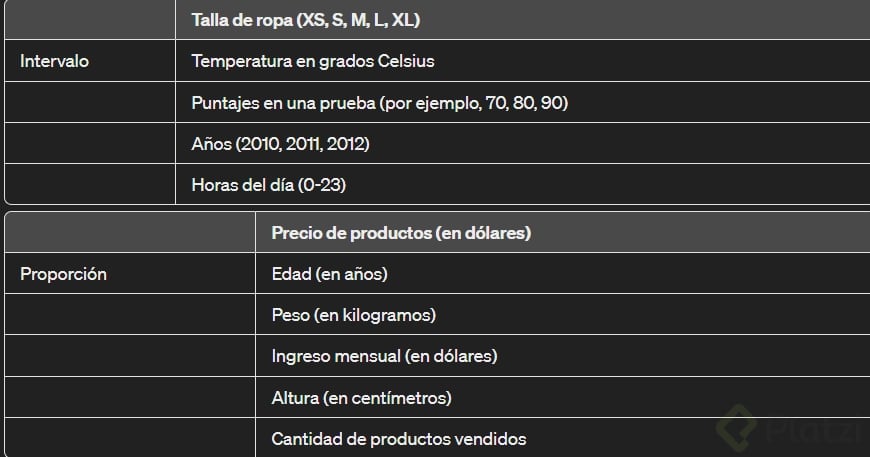 - Intervalo: Los valores pueden ser positivos o negativos; ejemplo: medidas de temperatura en grados.