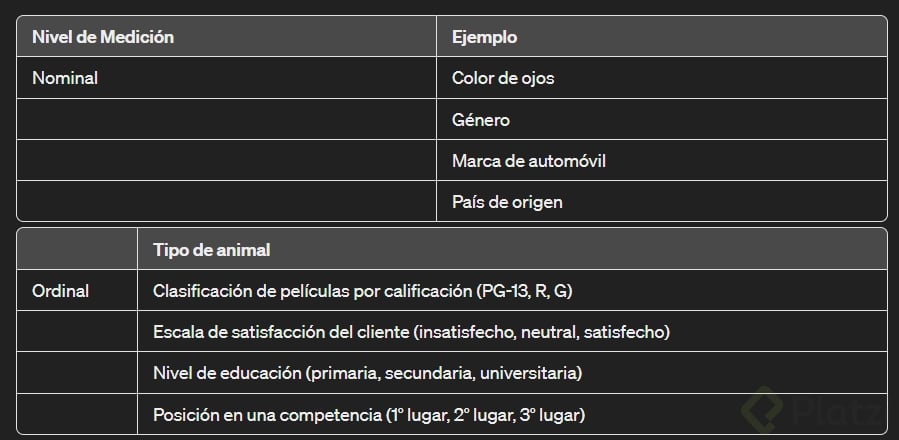 - Nominales: no tienen un orden intrínseco (ej., color del pelo).