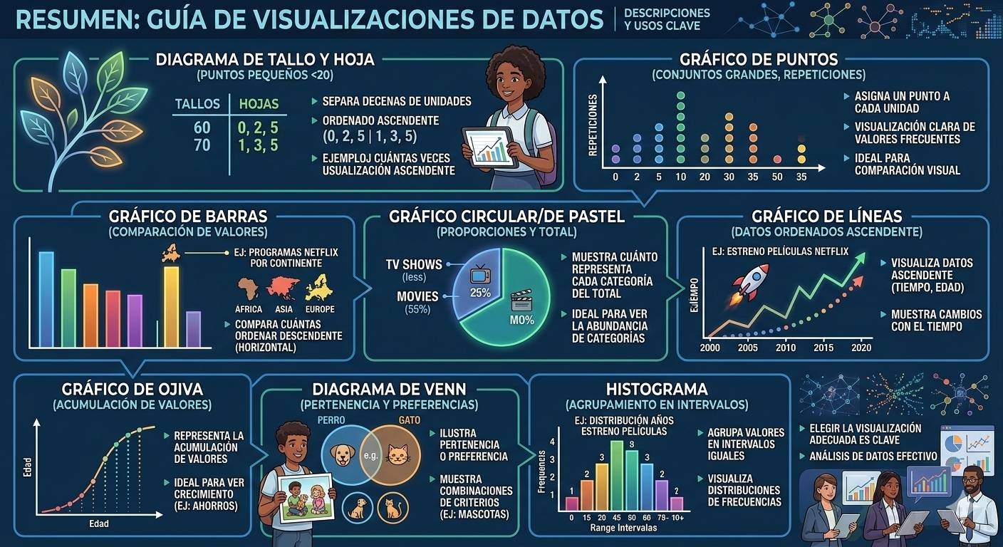 El diagrama de tallo y hoja es una visualización simple pero efectiva, ideal para conjuntos de datos pequeños, generalmente de hasta 20 elementos. Este tipo de gráfico separa las decenas de las unidades o, en caso de datos más grandes, los cientos o miles de los dígitos más pequeños. Por ejemplo, si se tiene un conjunto de puntajes que va del 60 al 75, las decenas (60 y 70) serían los "tallos", mientras que las unidades serían las "hojas", ordenadas de forma ascendente.