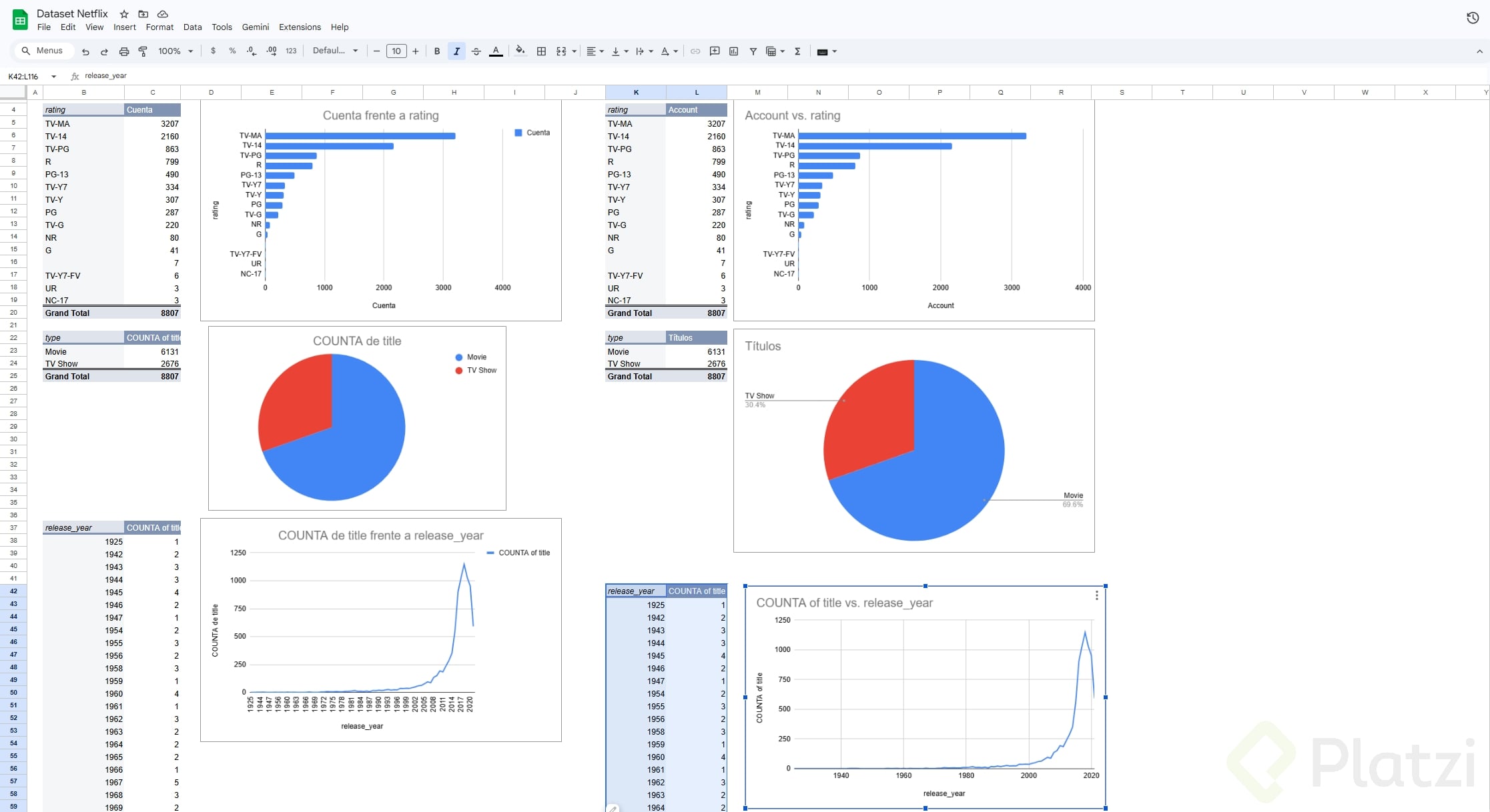 Un gráfico circular o gráfico de pastel también es una herramienta valiosa para visualizar proporciones dentro de un conjunto de datos. Esto permite ver cuánto representa cada categoría dentro del total. Si se compara el total de programas de televisión y películas en Netflix, el gráfico circular mostrará de manera clara qué categoría es más abundante dentro del conjunto.
