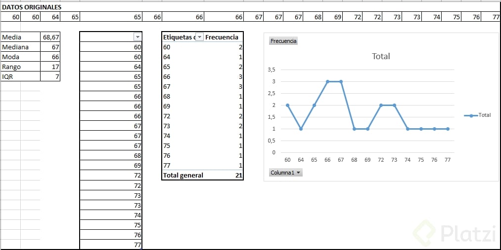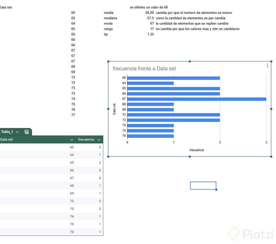 Te invito a que pruebes eliminando o agregando distintos valores a tu propio conjunto y compartas en los comentarios qué encontraste tanto en las medidas como en la gráfica de frecuencias.