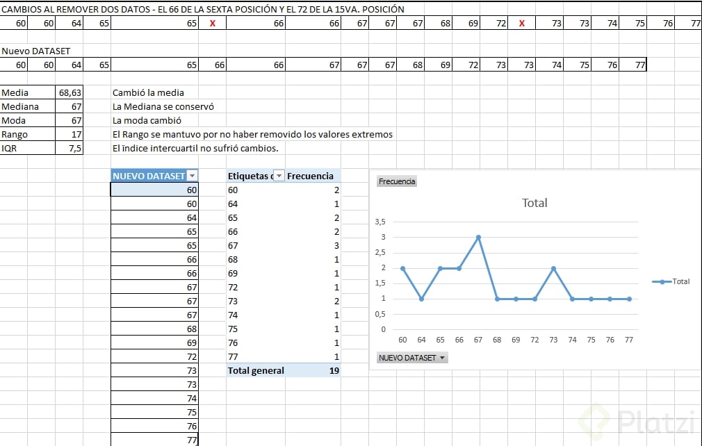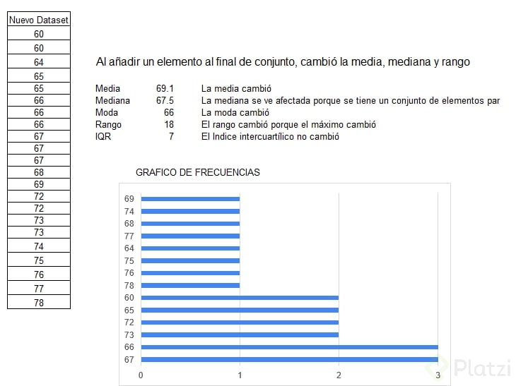 - La mediana pasa de 67 a 71, porque el punto medio del conjunto ordenado se mueve igual.