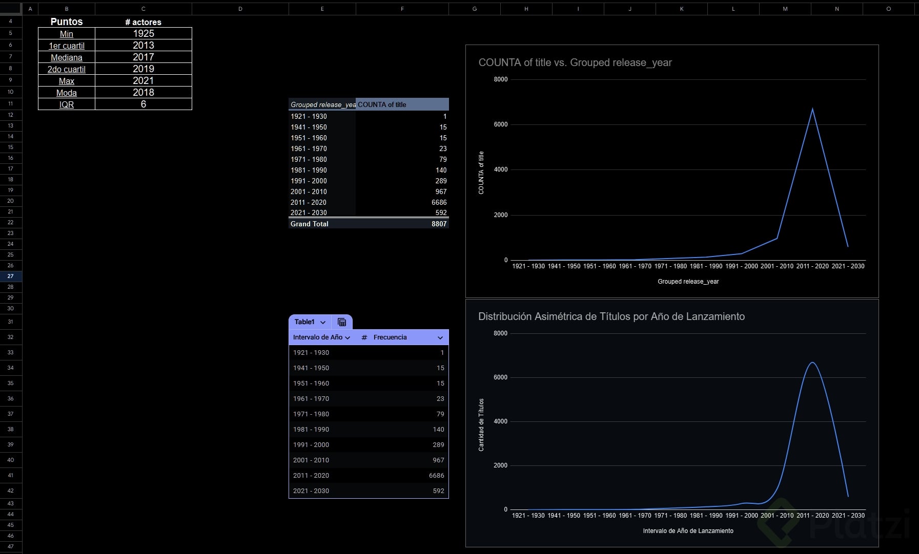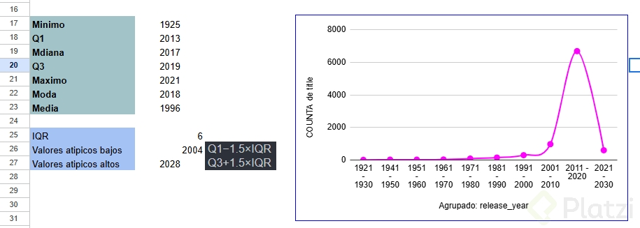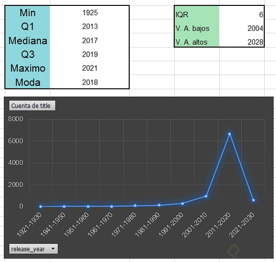 - Asimétrica negativa: La cola se encuentra hacia el lado izquierdo. Ejemplo: años de estreno de películas analizadas en un boxplot.