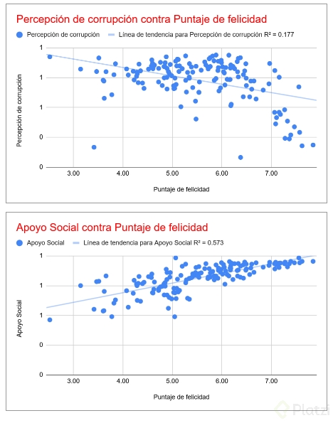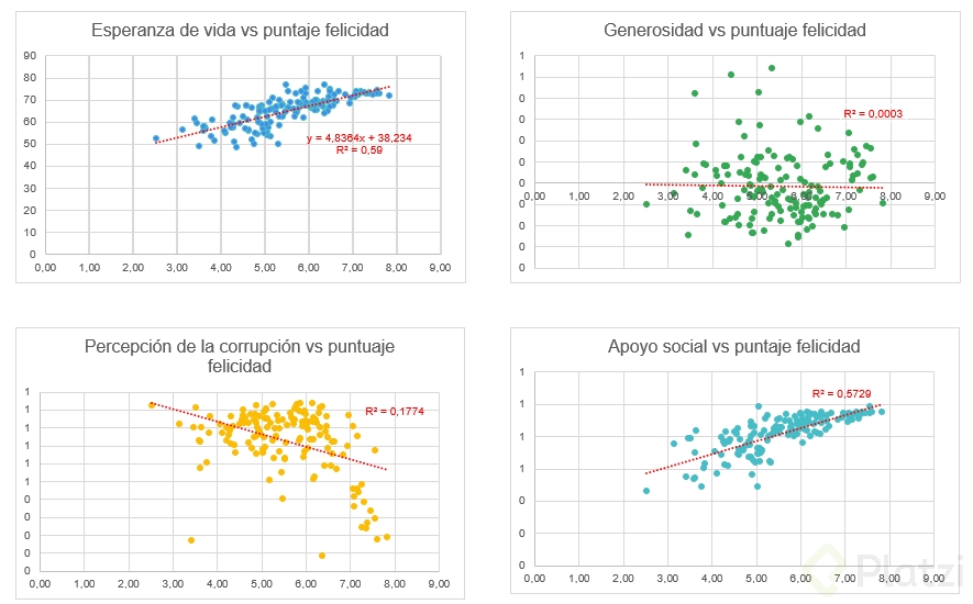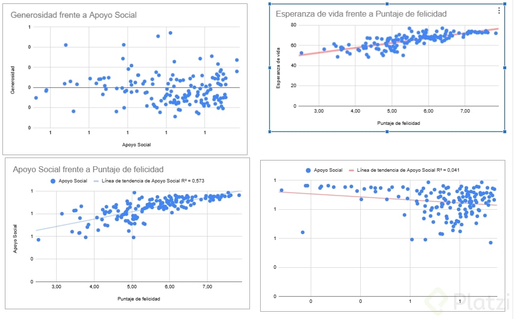 Un caso práctico podría incluir variables como la esperanza de vida y el score de felicidad de diferentes países. Al comparar estas variables en un gráfico de dispersión, podríamos discernir: