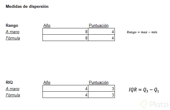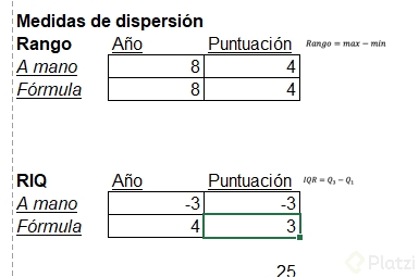 Las medidas de dispersión son herramientas estadísticas que nos permiten entender cuán juntos o separados están nuestros valores dentro de un conjunto de datos. En otras palabras, mientras que las medidas de tendencia central nos decían dónde estaba el punto de equilibrio, las dispersión nos indica cuál es el grado de variabilidad. En esta clase, abordaremos el rango y el índice intercuartílico, y más adelante veremos la desviación estándar, otra medida crucial de dispersión.