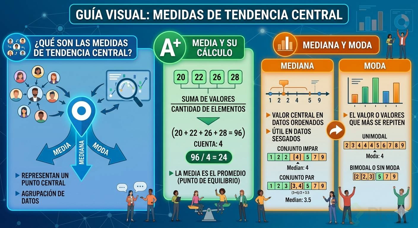 Las medidas de tendencia central son valores que representan un conjunto de datos, mostrando un punto central alrededor del cual los datos tienden a agruparse. Las principales medidas de tendencia central que veremos son la media, la mediana y la moda. Cada una tiene su método de cálculo y aplicación y aporta una perspectiva única sobre los datos.