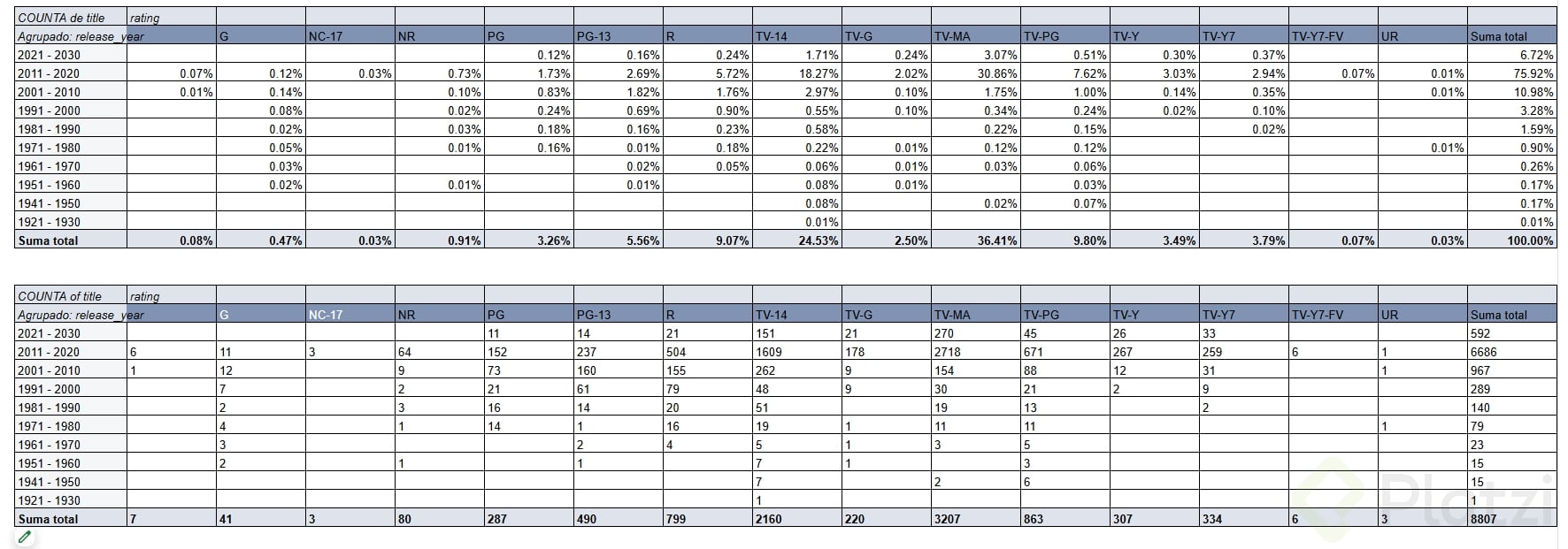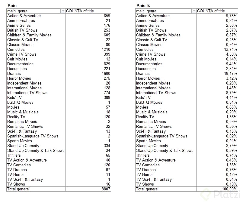 - Frecuencia relativa: Calcula el porcentaje del total para identificar que películas del 2011-2020 forman el 76% de las estrenos recientes en Netflix.