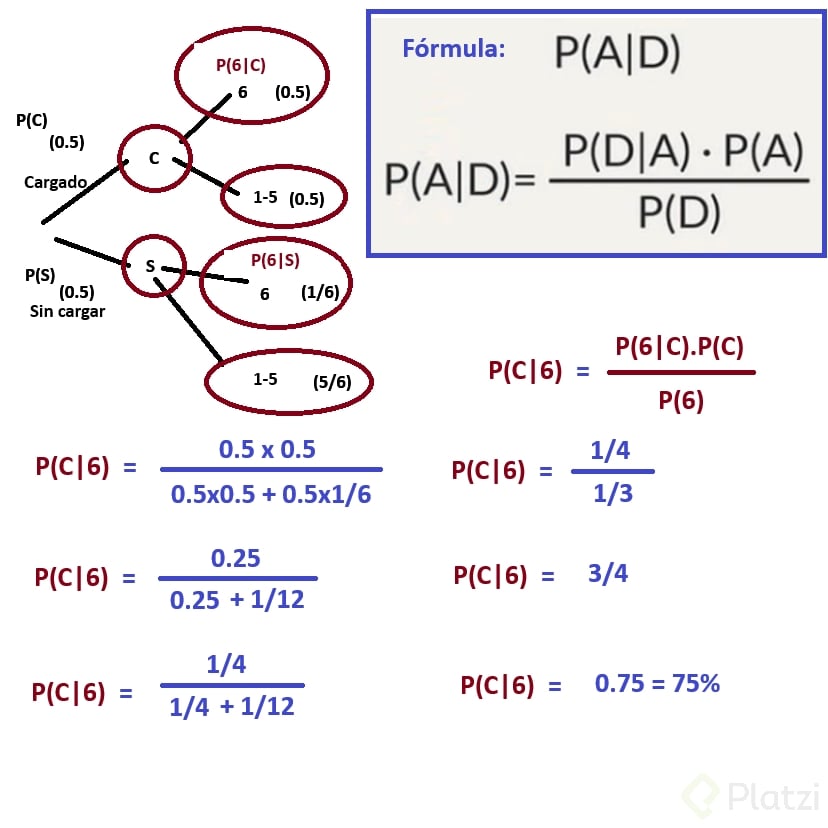 La fórmula nos muestra que al operar esas probabilidades, finalmente obtenemos que la probabilidad de que el dado sea cargado habiendo obtenido un 6 es del 75%.