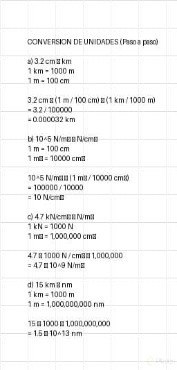 a) 3,2 cm a km. b) 10^5 N/m² a N/cm². c) 4,7 kN/cm³ a N/m³. d) 15 km a nm.