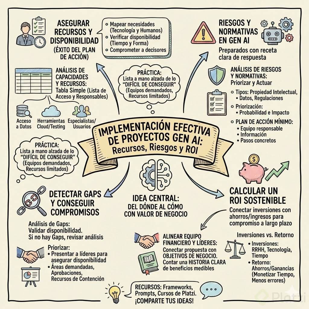 Para implementar proyectos de Gen AI con impacto real, necesitas más que una buena idea: asegurar recursos clave, anticipar riesgos y conectar todo con un ROI convincente. Aquí encontrarás una guía práctica, clara y accionable para pasar del dónde al cómo, sin perder de vista el valor para el negocio y el compromiso de los equipos.