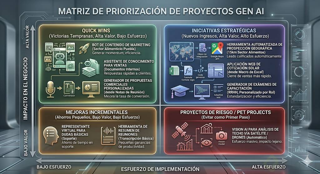La matriz 2x2 de impacto versus esfuerzo ordena los candidatos según recursos consumidos y impacto esperado. La meta: elegir “victorias tempranas” que demuestren valor tangible al negocio.