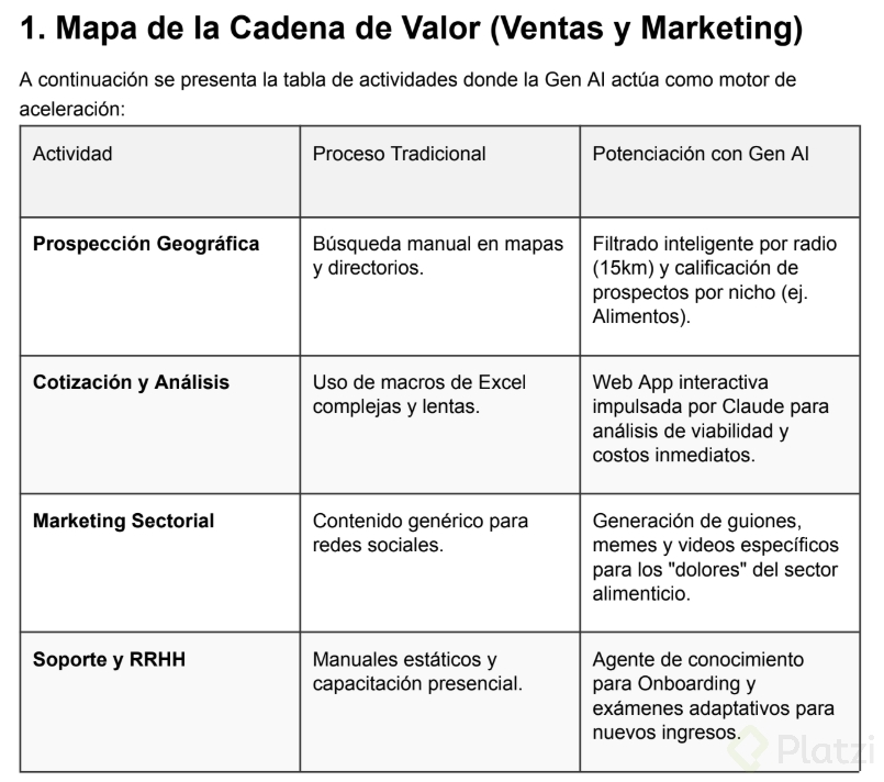Empezar por el análisis de la cadena de valor permite ver de forma integral las actividades primarias y de soporte que llevan tu producto o servicio al mercado. El objetivo: ubicar puntos de dolor donde la ineficiencia frena resultados y Gen AI puede acelerar tiempos o reducir errores.