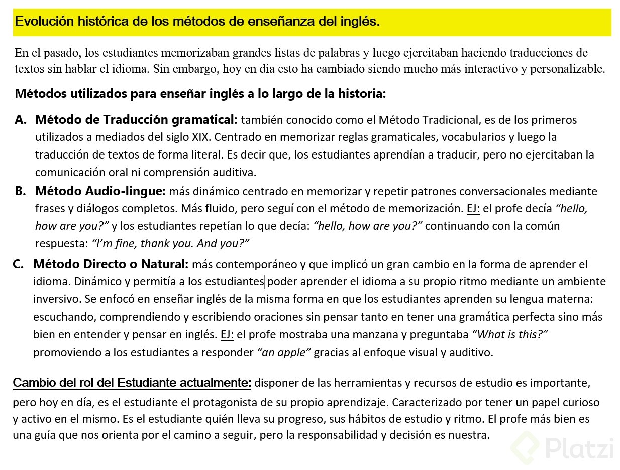 El aprendizaje de inglés cambió de la memorización y la traducción al uso de tecnología e inteligencia artificial. Aquí entenderás, de forma clara y práctica, cómo evolucionaron los métodos de enseñanza y por qué hoy tu rol activo, autónomo y curioso es la clave del progreso.
