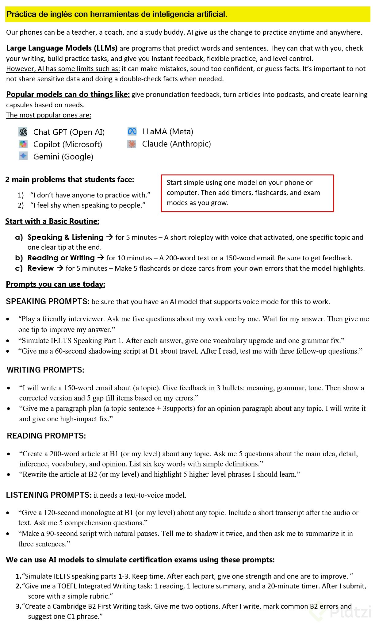 AI works as a teacher, coach, and study buddy. A large language model predicts words and sentences, so it can chat with you, check writing, and build practice tasks. You can use popular models like ChatGPT, Copilot, Gemini, LLaMA, and Claude. Results are similar across tools when you use clear prompting.
