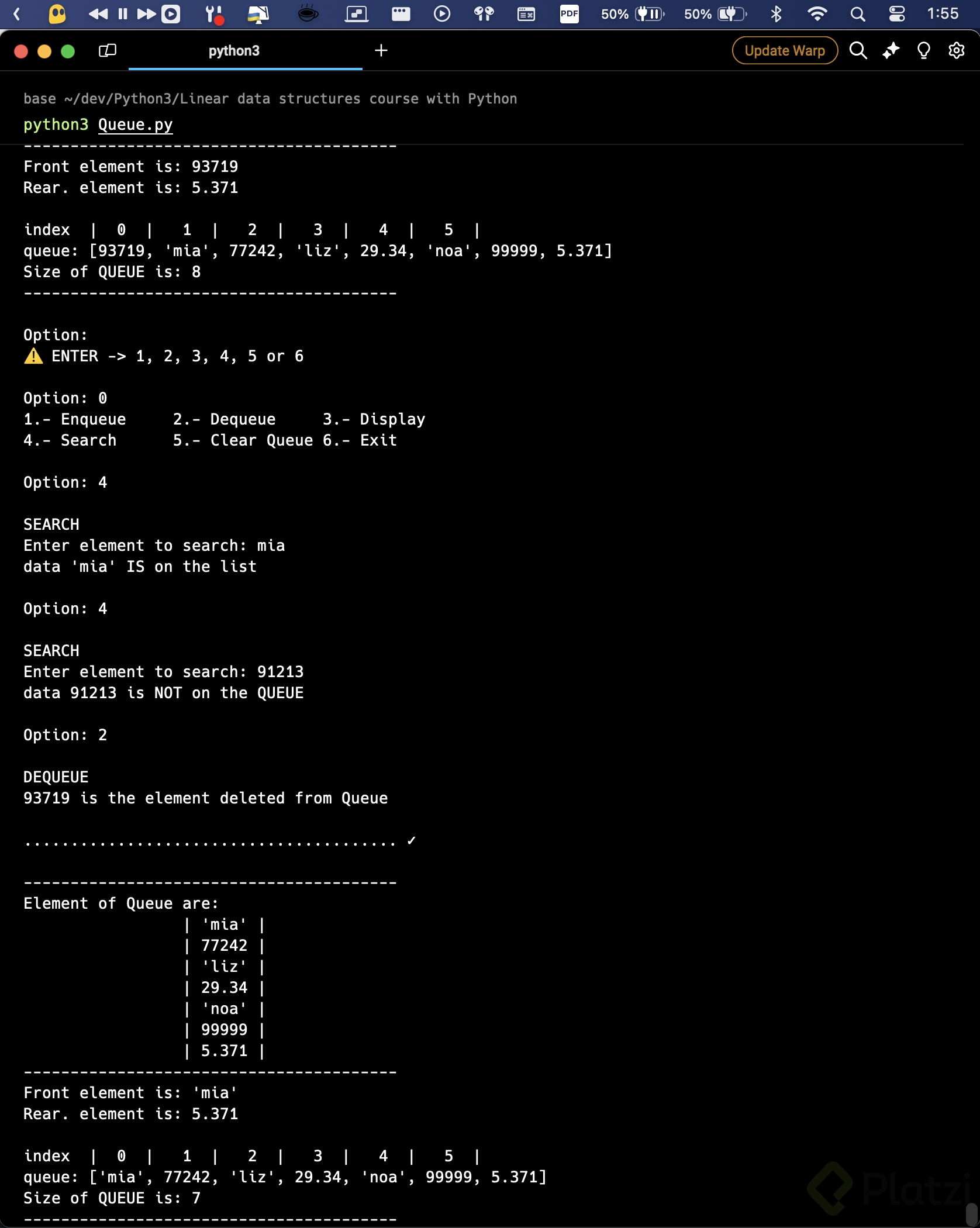 Finalmente, en un entorno interactivo de Python, importamos y probamos la clase ListQueue: