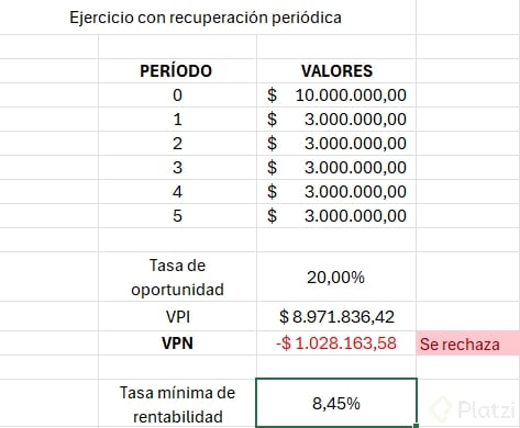 El Valor Presente Neto nos permite evaluar si una inversión es viable considerando el valor del dinero a través del tiempo. Para ilustrar su cálculo, consideremos una inversión de diez millones de unidades monetarias, que genera un ingreso de tres millones durante los próximos cinco años, con una tasa de oportunidad del 20%.