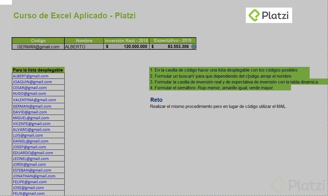 Repite el flujo usando como clave el mail en lugar del código. Si es necesario, ajusta la tabla de datos. Mantén la lógica: lista para seleccionar, BUSCARV para traer información, vínculo con tabla dinámica y semáforo con formato condicional.