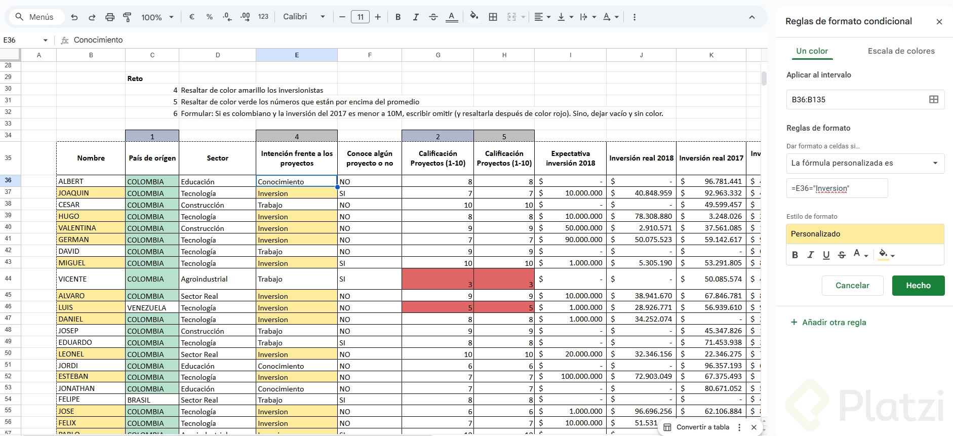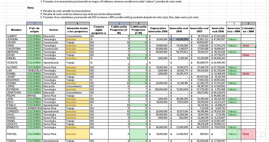 Resaltar países específicos: Puedes configurar una regla para que todos los registros relacionados con un país como "Colombia" sean destacados en verde, permitiendo un análisis rápido de datos filtrados.
