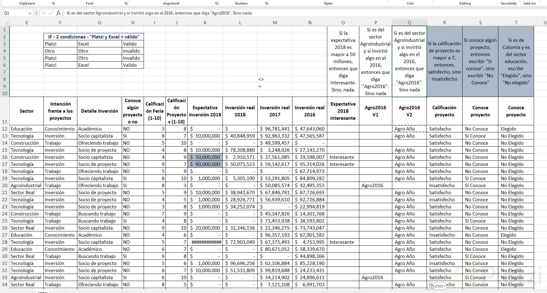 La práctica es esencial. Intenta formular diferencias, como identificar inversiones donde el sector es "agroindustrial" y hubo inversión en 2016. La clave aquí es comprender cómo usar operadores de desigualdad (<>) para reconocer condiciones no cumplidas.