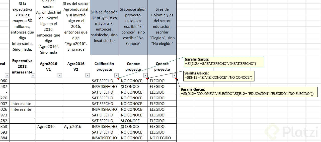 - Condición 1: Si la celda F3 contiene "Platzi".