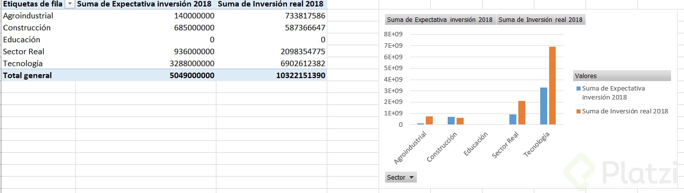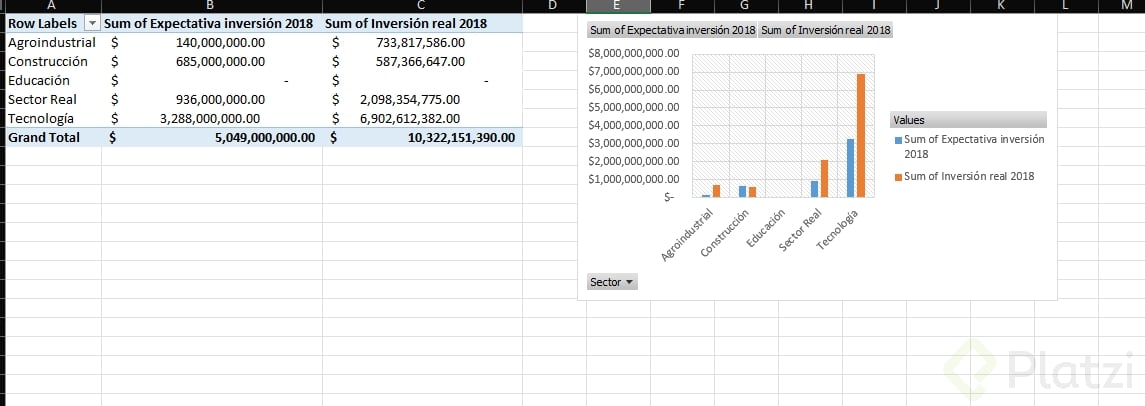 - En "Valores" de la tabla dinámica, coloca "Inversión Real 2017" y "Inversión Real 2018".