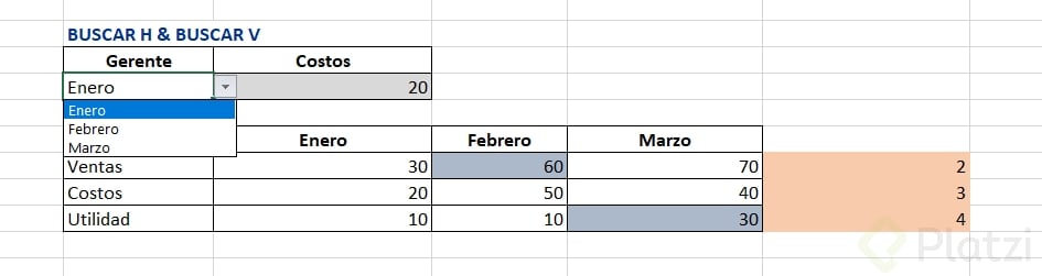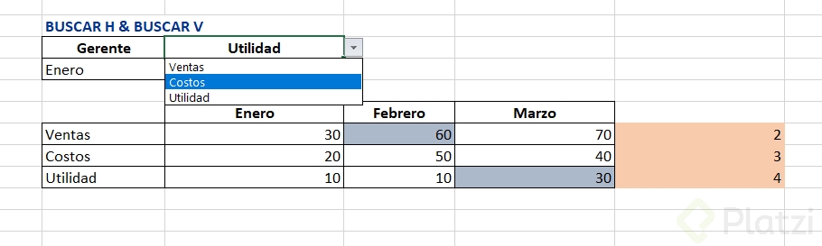 - Indicador de filas: Especifica la fila desde la cual deseas obtener un valor. Por ejemplo, fila 2 para ventas, fila 3 para costos.
