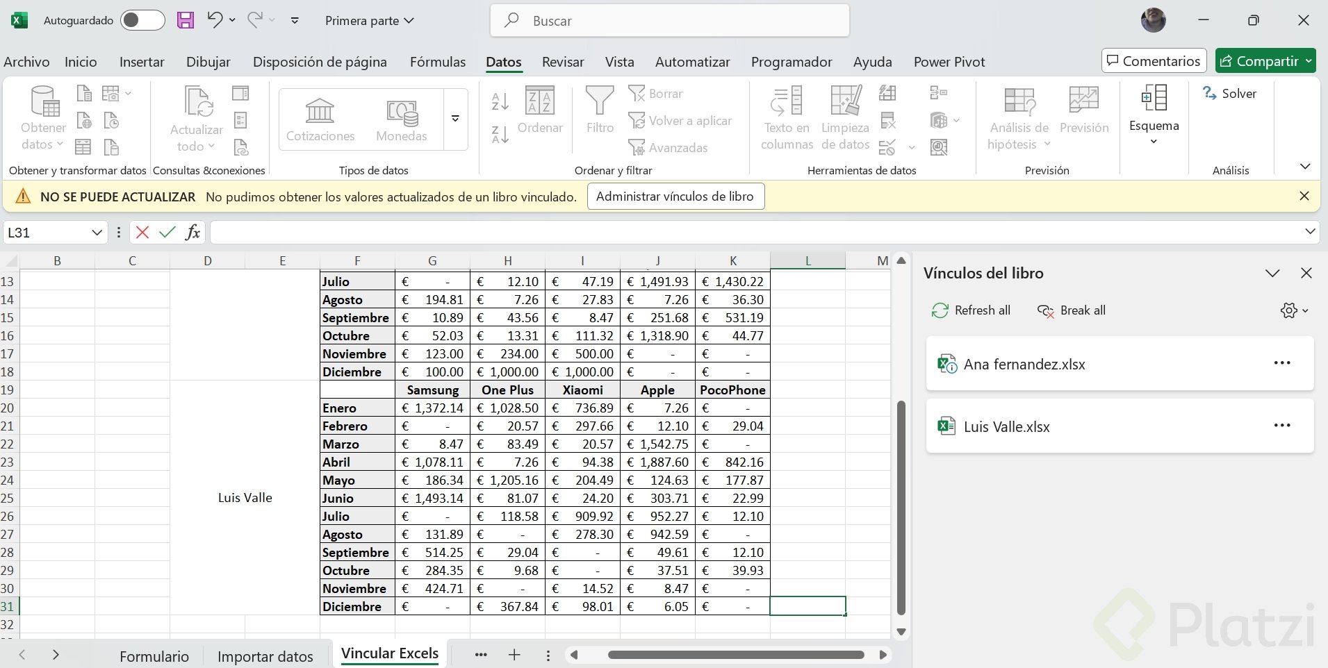 - Si aún así no se actualizan, ve a 'Editar vínculos' dentro de la pestaña de 'Datos', selecciona el archivo problemático y comprueba el estado.