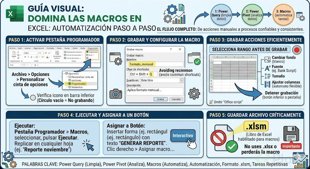 Domina las macros en Excel para acelerar tareas repetitivas y estandarizar tus reportes. Aquí verás cómo activar la pestaña Programador, grabar una macro paso a paso, ejecutarla con un botón y guardar tu archivo en formato compatible. Además, entenderás cómo se relaciona con Power Query y Power Pivot para un flujo completo: limpia, analiza y automatiza.
