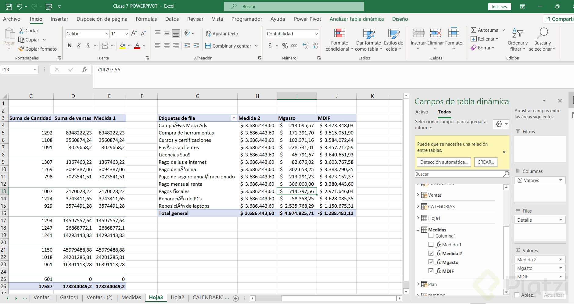 Seguí las instrucciones de la profe Dani. Creé la tabla Medidas desde Power Query y le di en "Cargar y Cerrar". Pero cuando iba a Power Pivot no aparecía la tabla. Tuve que agregarla manualmente al modelo de datos, si no, no me aparecía