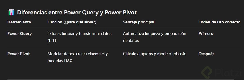 Power Query es la “cocina” donde limpias y transformas datos: quitas, pones, anexas y preparas ingredientes para el modelo. Power Pivot es el cerebro matemático: relaciona tablas y ejecuta cálculos que Power Query no alcanza por potencia o por la necesidad de relaciones entre tablas.