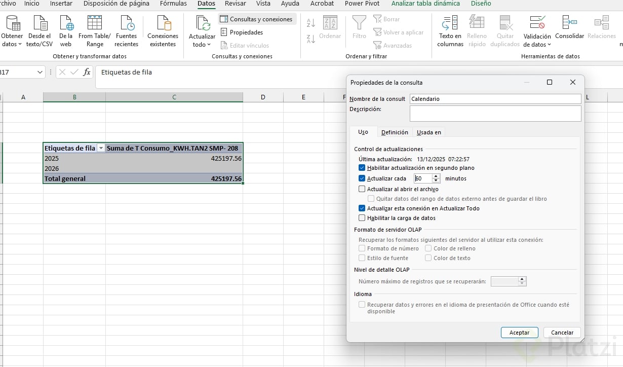 Para evitar dudas sobre la versión más reciente, configura la actualización automática. En Excel, clic derecho sobre la conexión > propiedades > control de actualizaciones. Define cada cuántos minutos se actualiza (por ejemplo, cada 60) o que ocurra cada vez que se abra el archivo.