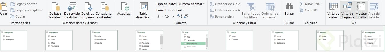 - Repetir el proceso para cada tabla clave: gastos, descripción, ventas, clientes, productos.