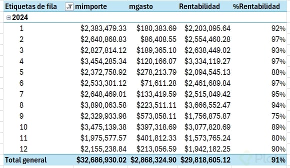 Valores por años (ej.: 2024 y 2025) y sus meses.
