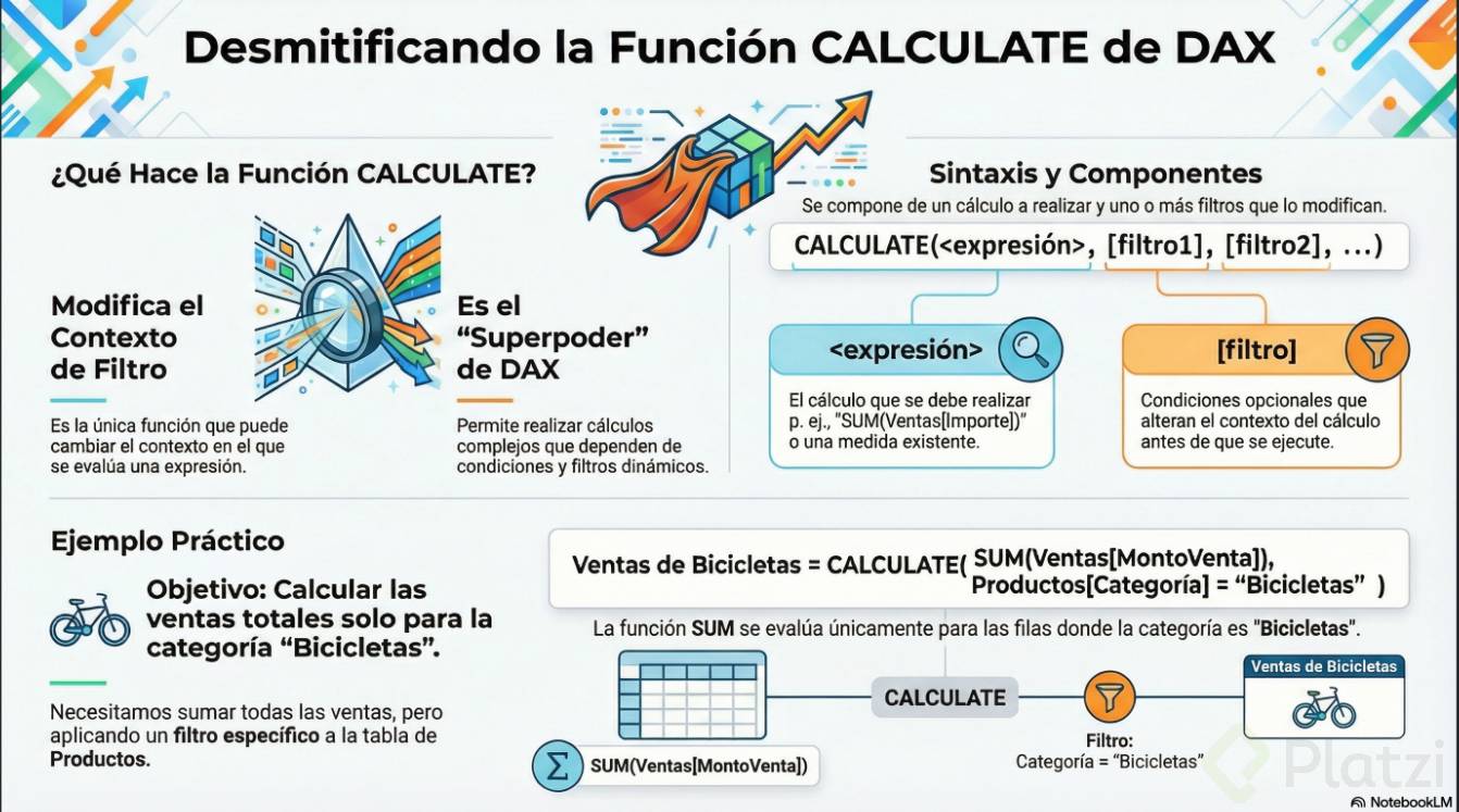 CALCULATE es el corazón de DAX: modifica el contexto de filtro de una medida. Con SUMX calculas ventas fila por fila (cantidad por precio) y con FILTER aplicas condiciones más específicas.