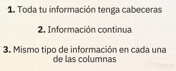 Una tabla bien organizada facilita todo el trabajo posterior en Excel. Los puntos esenciales para lograrlo son:
