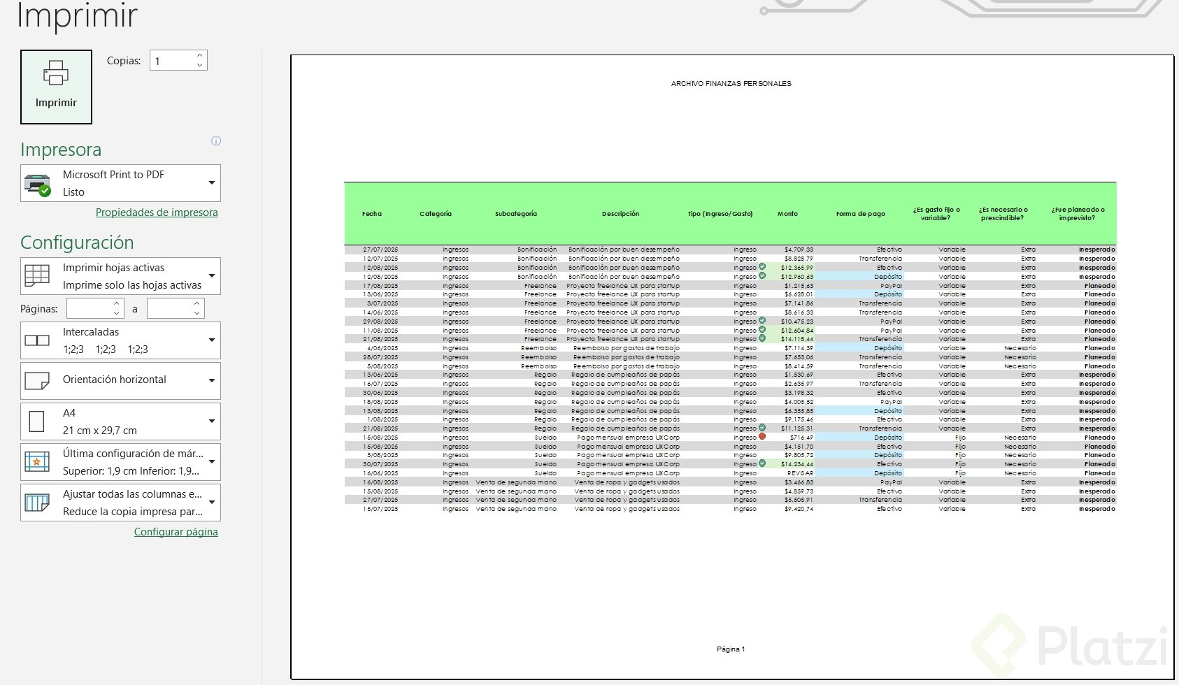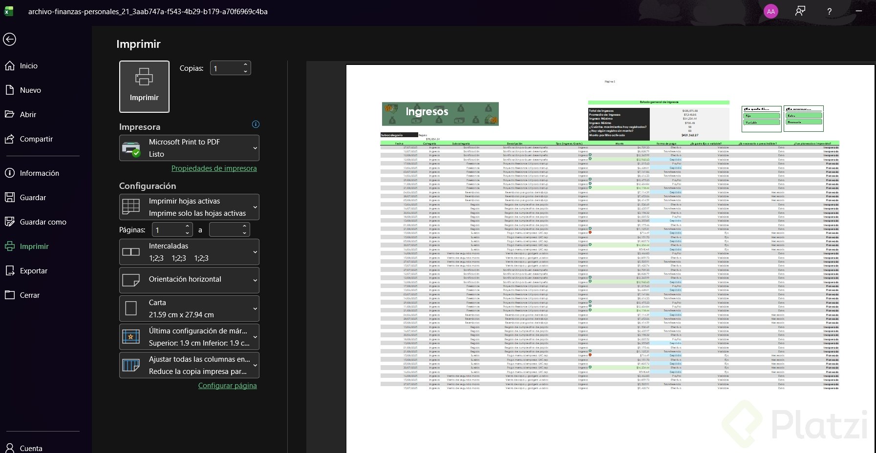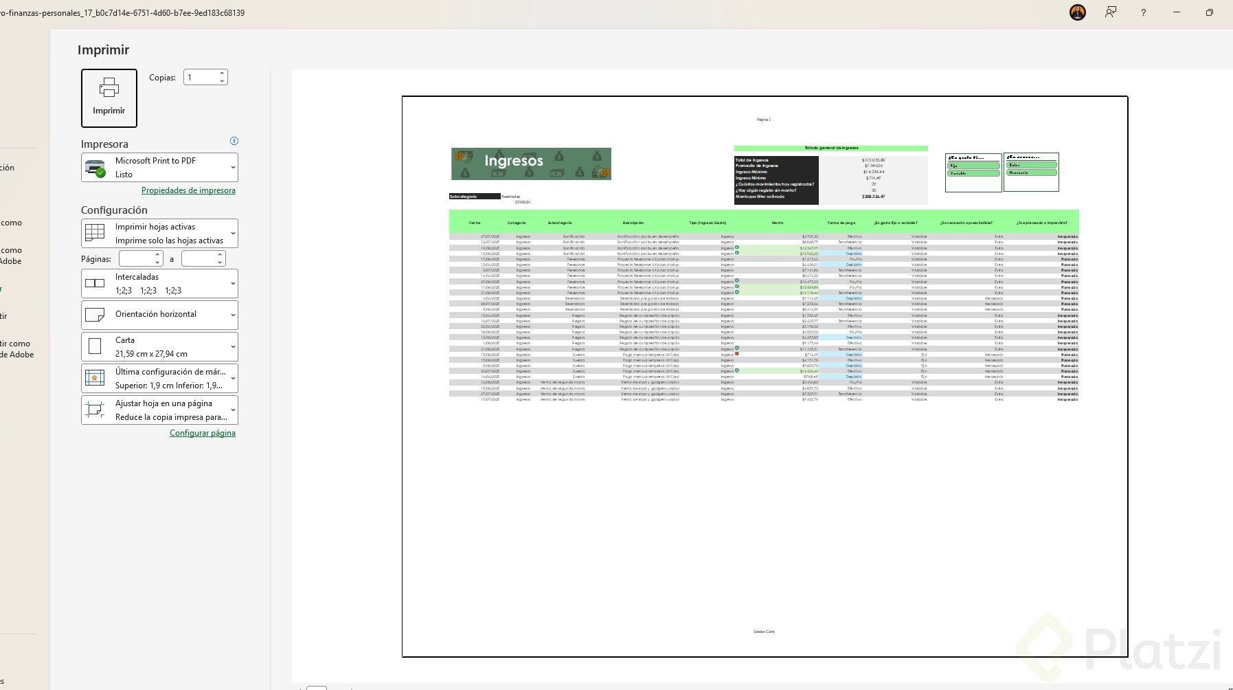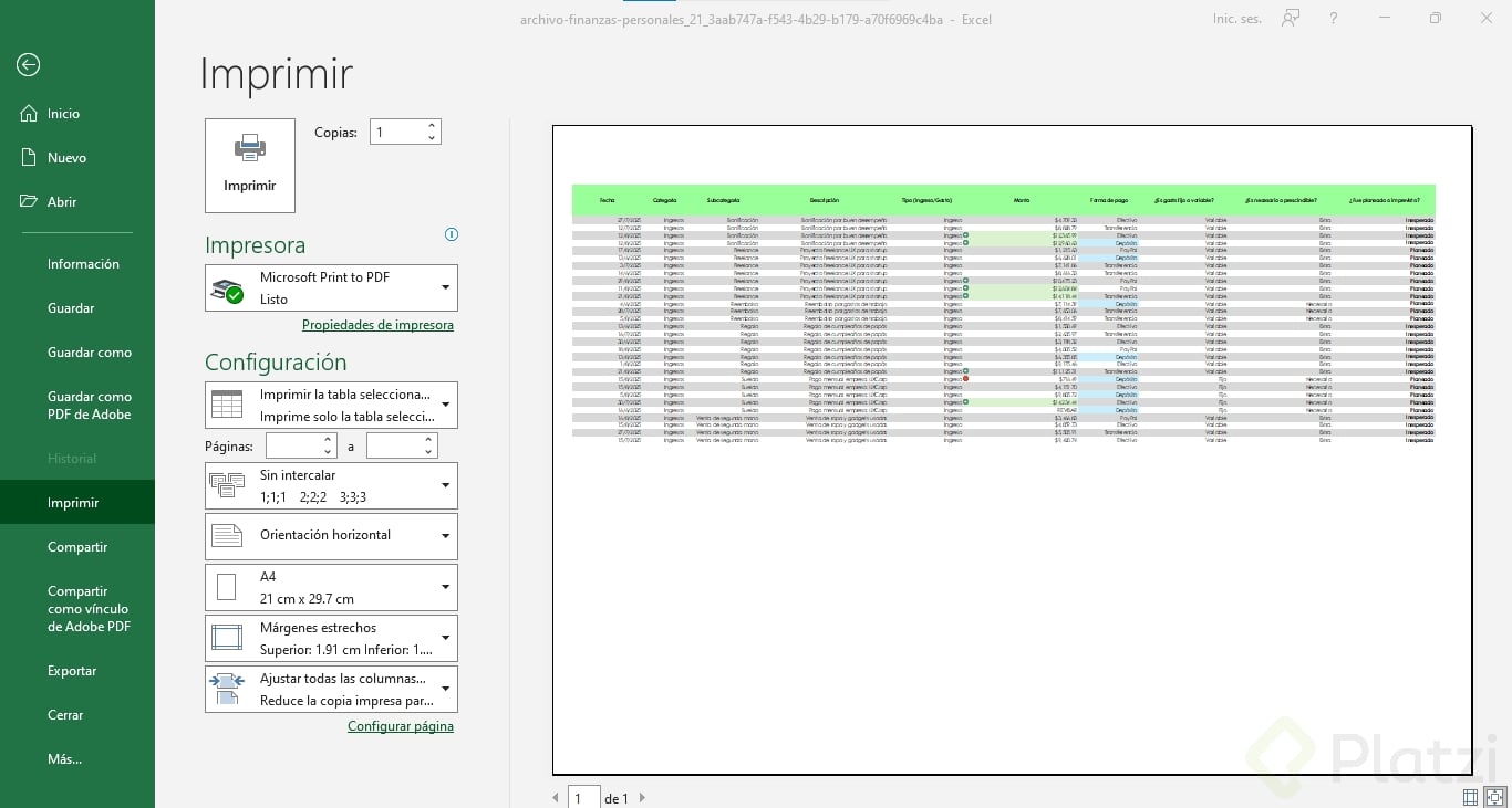 Antes de imprimir, revisa si quieres imprimir solo ciertas hojas, el libro completo o solo la selección activa. Además, asegúrate de tener seleccionada la impresora correcta o usa la opción para guardar en PDF si prefieres formato digital.