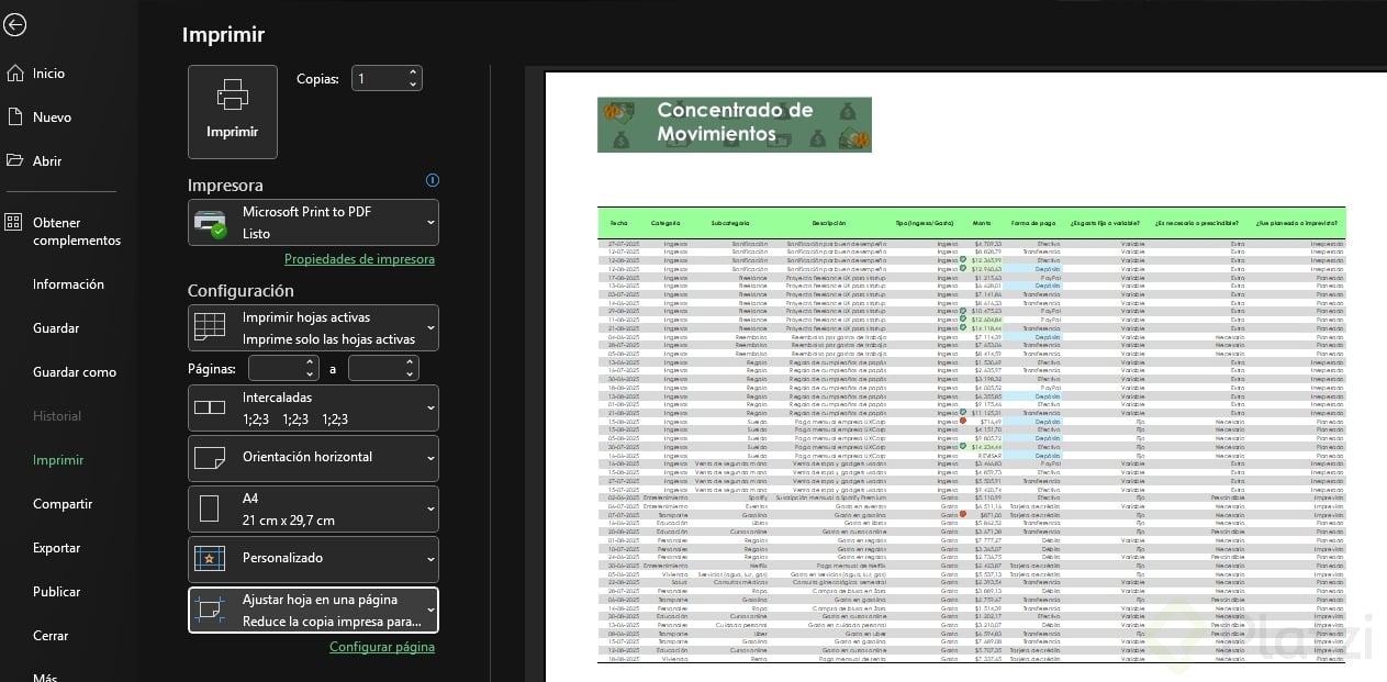Usa el atajo Control P para llegar rápidamente a la vista de impresión. Aquí verás tu documento tal como saldrá en papel. Es fundamental revisar la orientación; puedes alternar entre vertical y horizontal según convenga a tus datos. La opción de escalado es útil para adaptar toda la información a una sola hoja o distribuirla por columnas o filas, según lo que necesites mostrar.