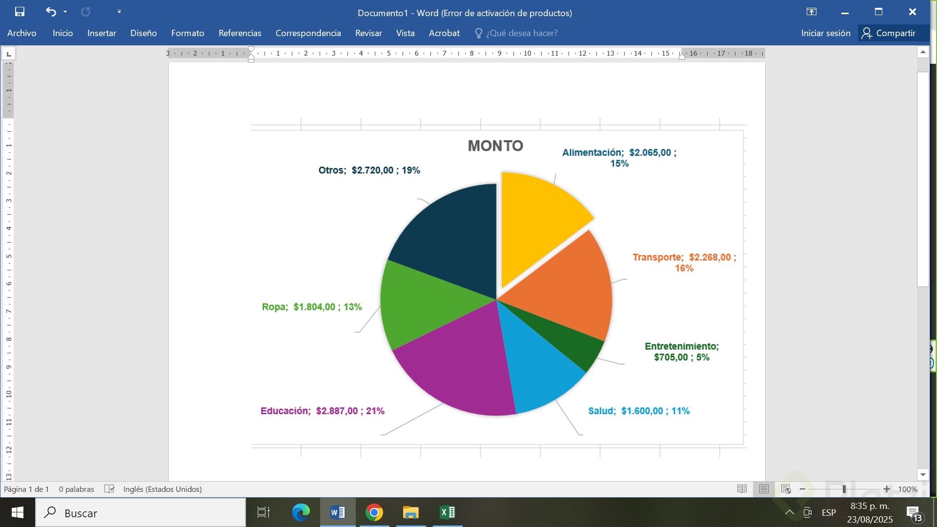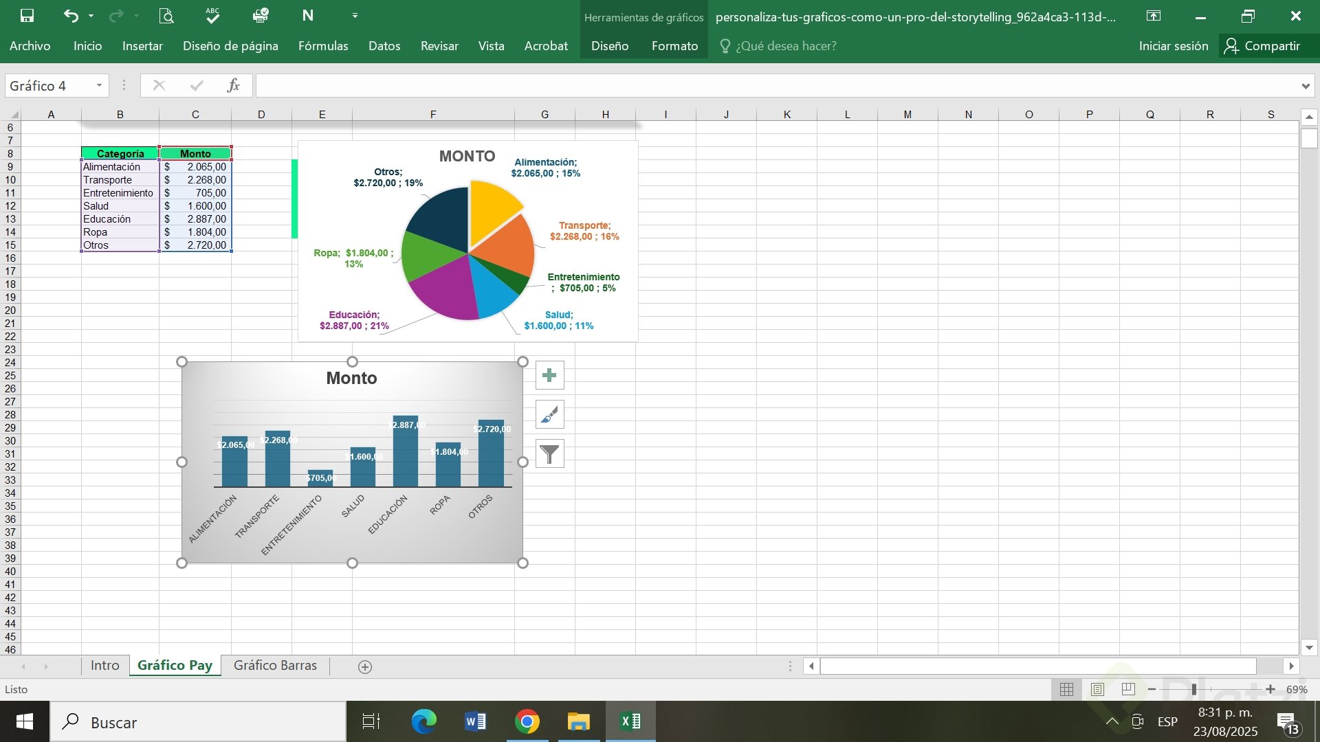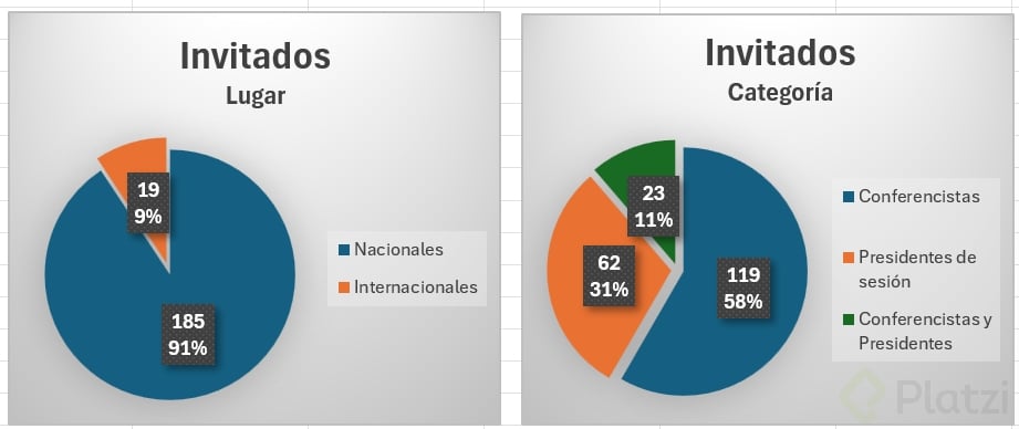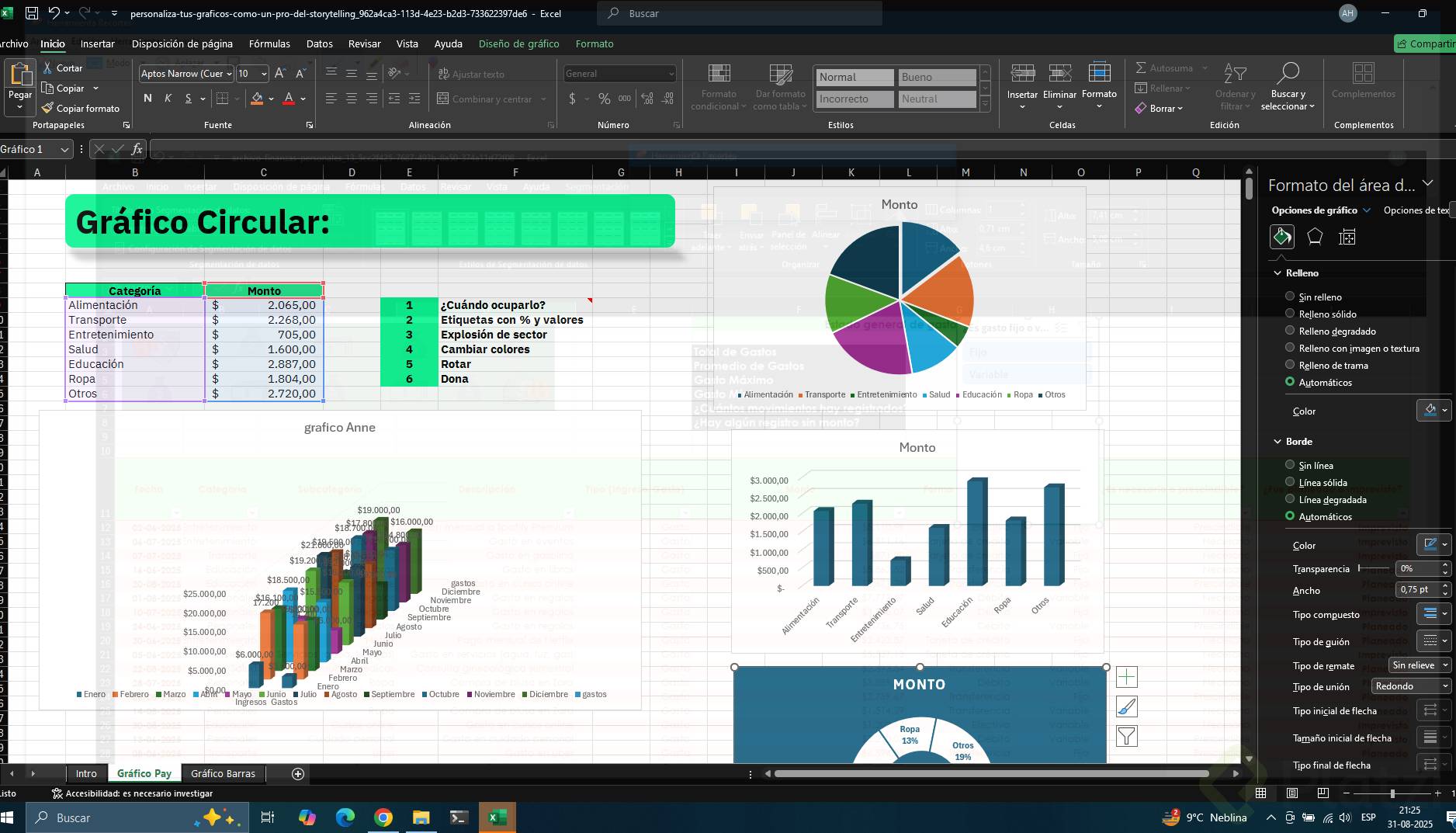 Consejos de personalización: - Agrega etiquetas de datos con clic derecho sobre el gráfico para visualizar valores, porcentajes o ambos. - Utiliza la opción de explosión del sector para destacar segmentos importantes moviendo una sección del gráfico hacia afuera. - Cambia el ángulo del primer sector para resaltar un elemento específico. - Modifica colores desde la paleta estándar, seleccionando monocromáticos o los de tu empresa; cada elemento puede personalizarse desde la pestaña Formato.