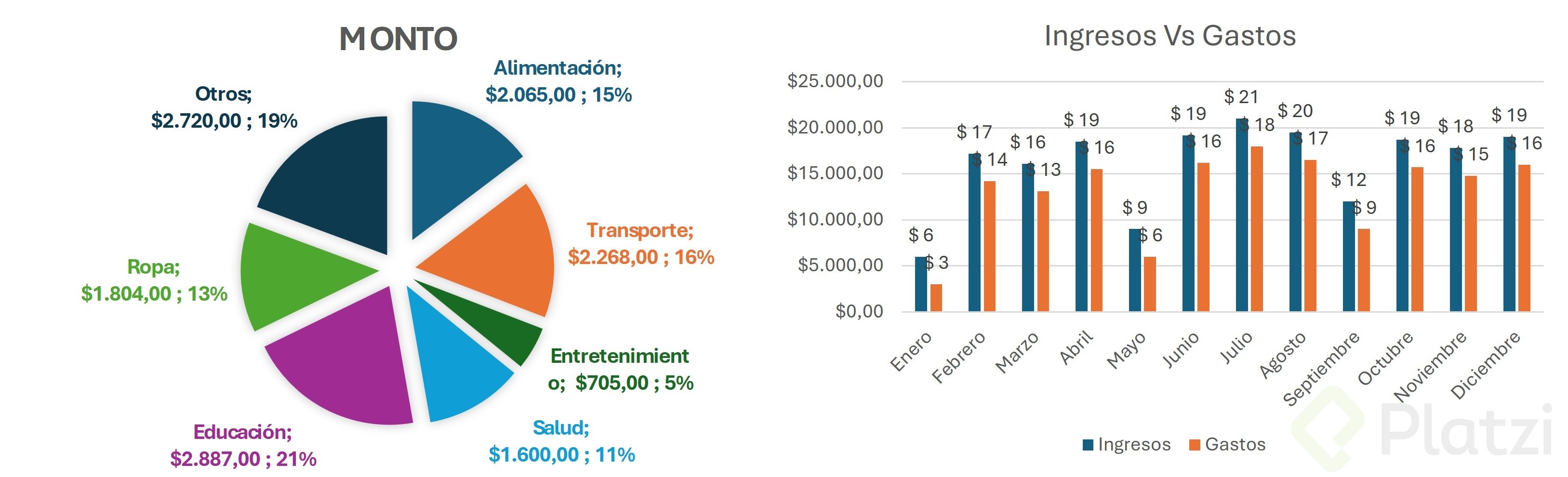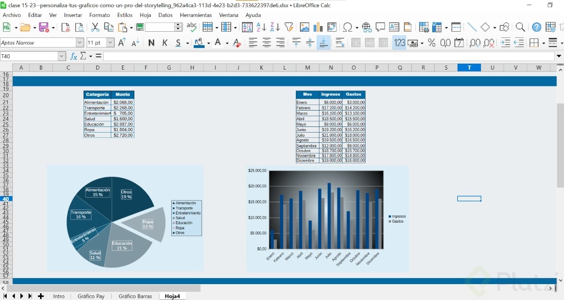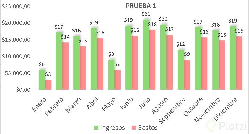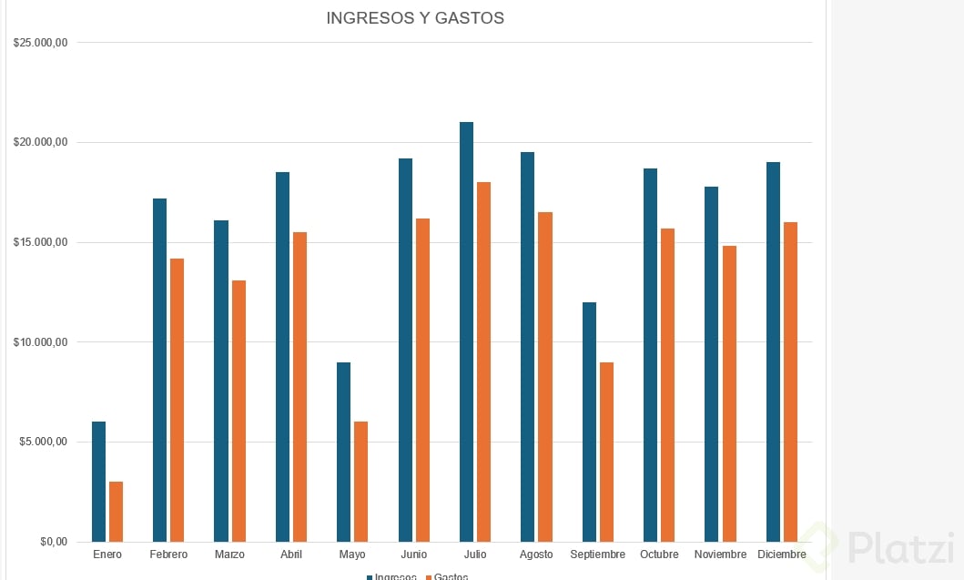 Opciones de personalización clave: - Personaliza el ancho de rango para cambiar el grosor de las barras. - Agrega etiquetas de datos con clic derecho. Si se muestran centavos y prefieres otra presentación, ve a Formato de etiquetas de datos, selecciona la sección Número, y opta por el formato personalizado (por ejemplo: signo de pesos, puntos de miles). - Cambia la visualización de los ejes seleccionando la opción Cambiar fila/columna en el diseño de gráfico si necesitas invertir los valores. - Agrega series nuevas (por ejemplo, gastos además de ingresos) desde la opción Seleccionar datos y ajusta etiquetas o valores según tus necesidades.